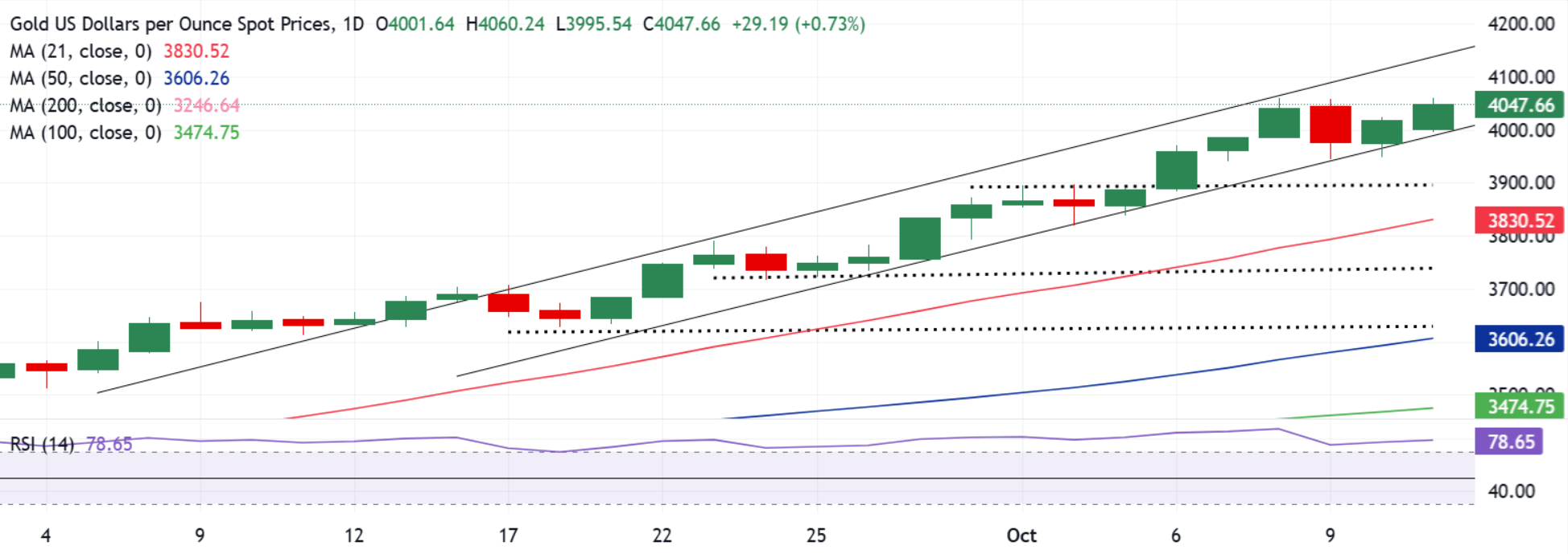 金价周一连续第二日上涨,成功稳守4000美元整数关口,并进一步上攻至4060美元附近。