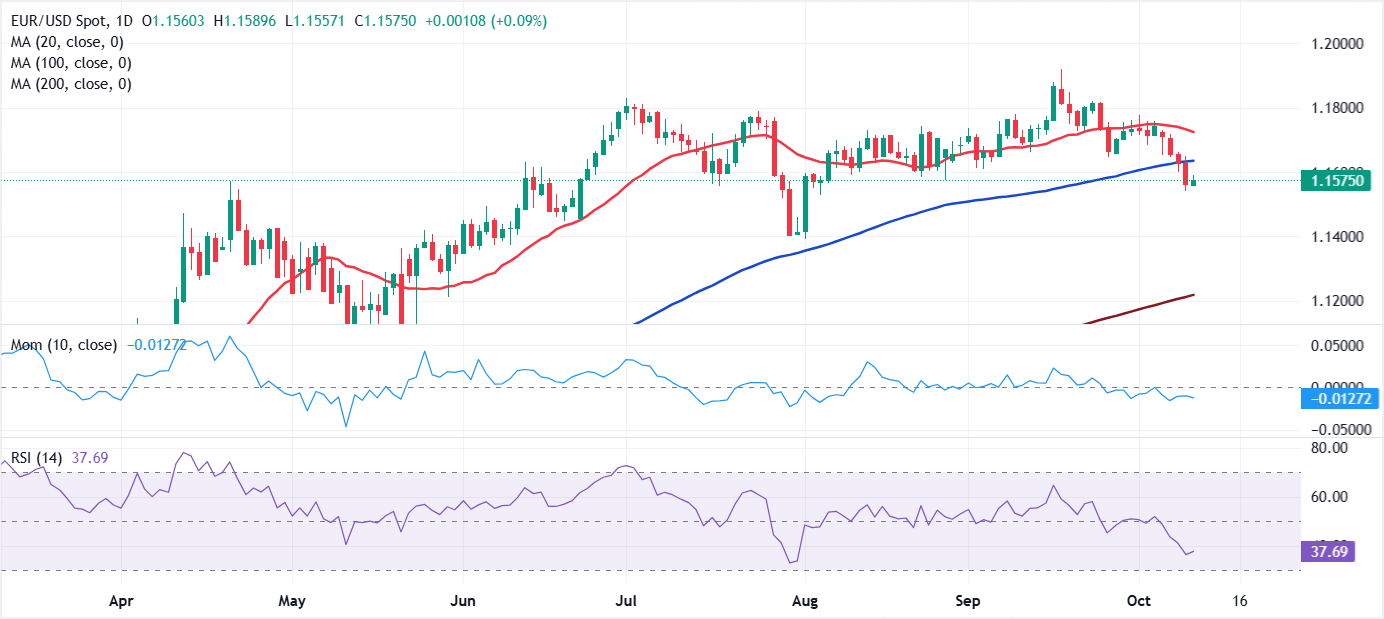 该货币对已自3月以来首次跌破20日均线(1.1640附近),并在100日与200日均线下方运行。