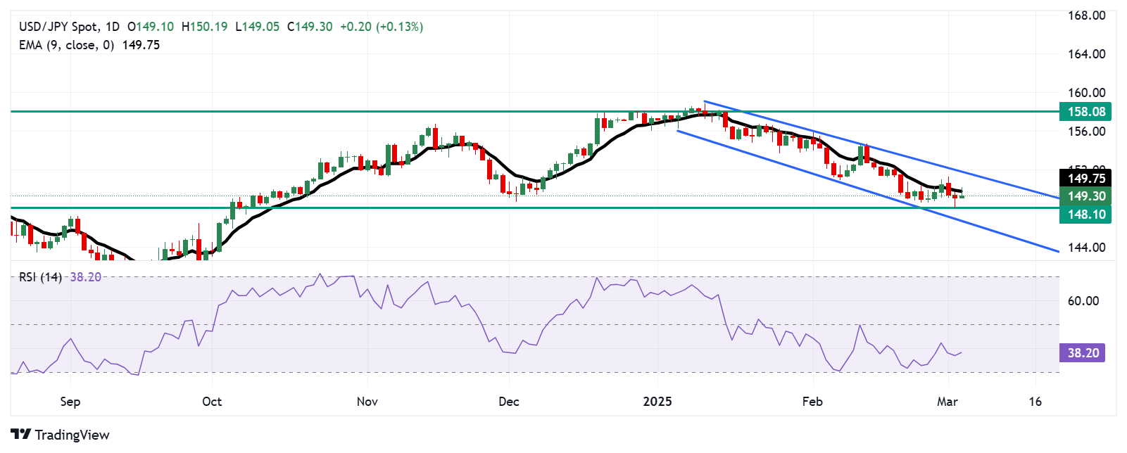 美元/日元在连续两天下跌后上涨,周三欧洲时段交投于 149.40 附近。 一分析日线图显示美元/日元货币对在下降通道内向下移动,表明已确认看跌偏见。