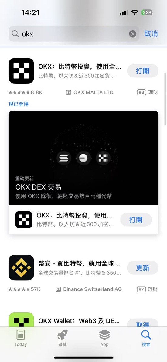 注意搜索时输入 OKX,不是“欧易”,也不是“OKEX”。