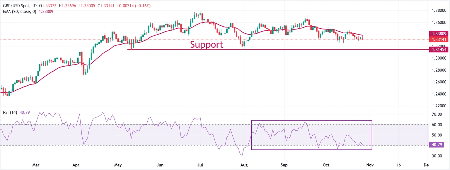 若英国后续经济数据继续疲软,英镑或在1.33下方扩大调整空间。投资者短线关注美联储决议与英国央行11月会议前的政策信号。
